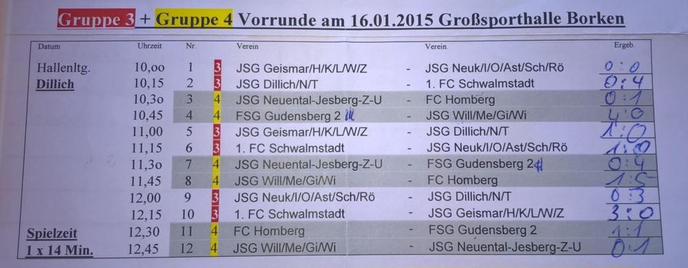 Dabei qualifizierten sich die B-Jugendlichen des 1.FC Schwalmstadt und der JSG Geismar/H/K/L/W/Z in der Gruppe 3 und die FSG Gudensberg II und der FC Homberg in der Gruppe 4 für die Hallenendrunde in Treysa am 30.01.2016.
