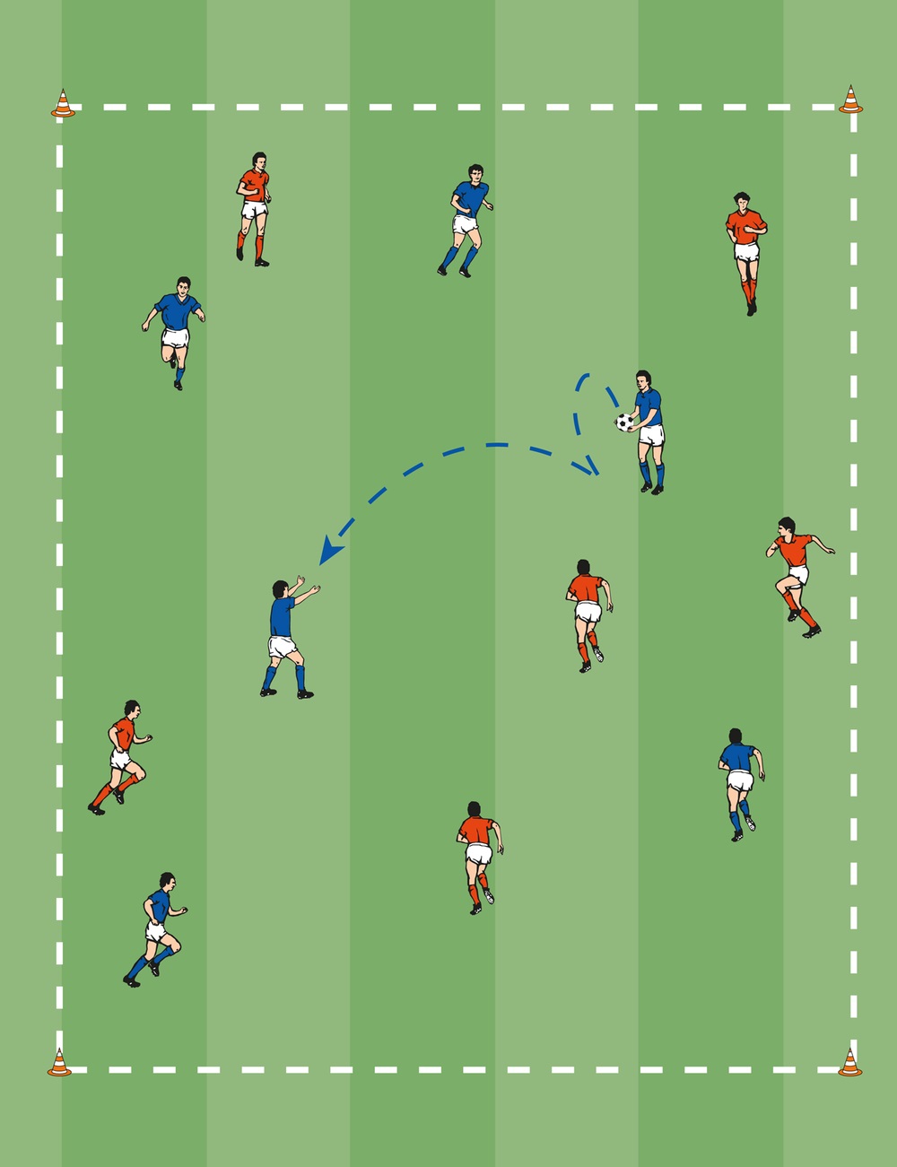 - Ob die Zuspiele direkt, mit dem zweiten Kontakt oder nach Aufspringen erfolgen, dem Leistungsstand der Spieler anpassen. Der Ball kann auch geworfen werden.