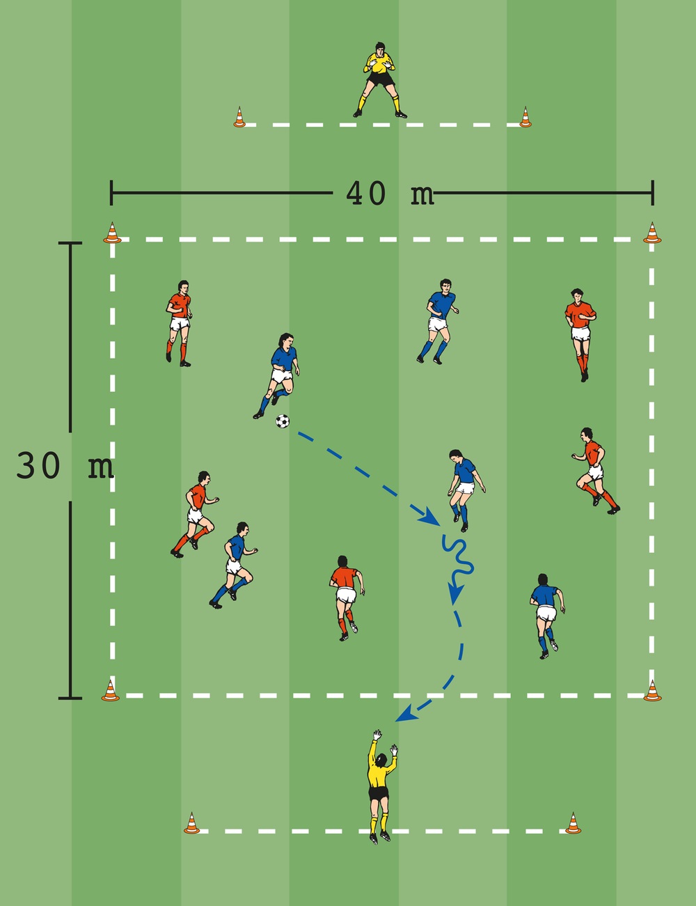 - Ein Offentor mittig in einem 40 x 30 Meter großen Feld sowie 4 breite Dribbeltore auf den Grundlinien markieren.