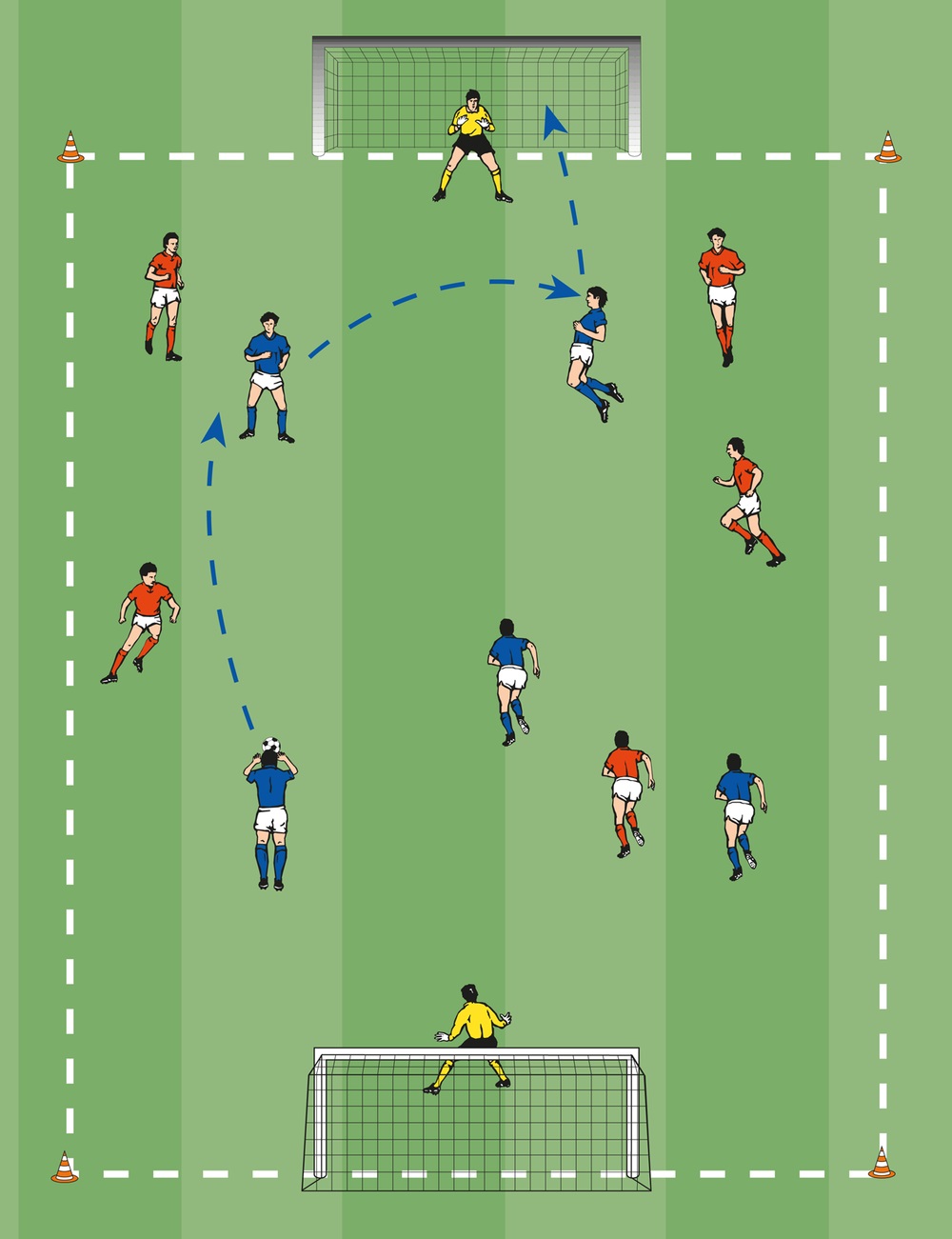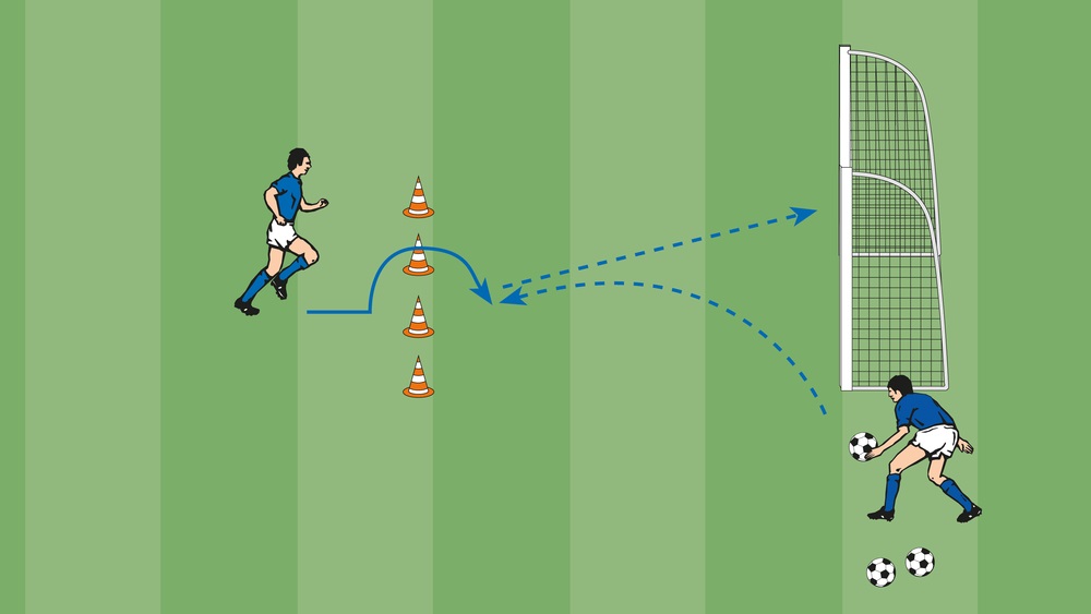 - Flugball von der Außenlinie zu dem Torhüter, der fängt und zurückwirft, nachdem der Spieler die Stangen per Skippings überwunden hat.