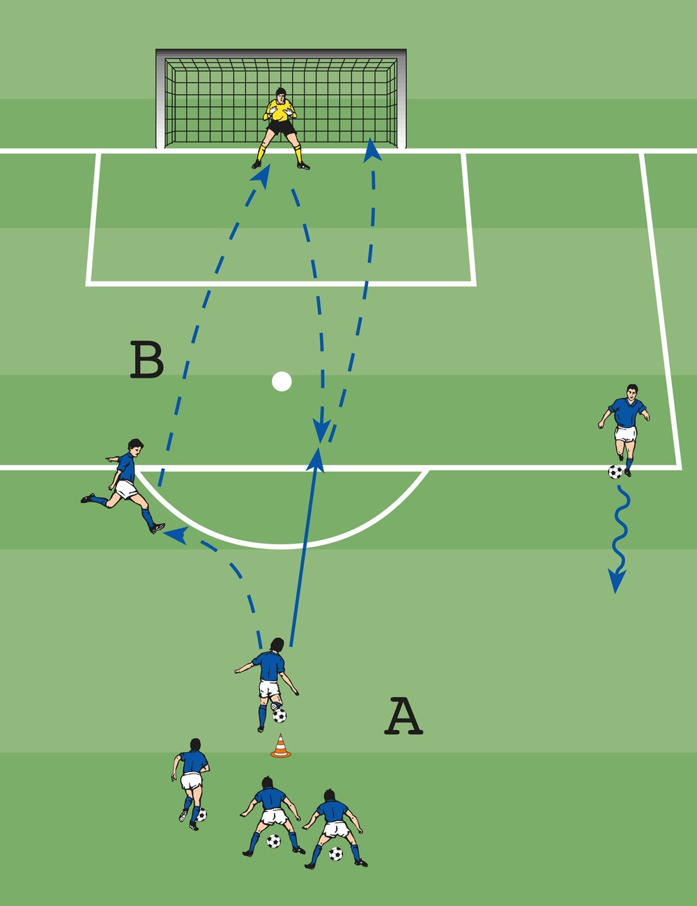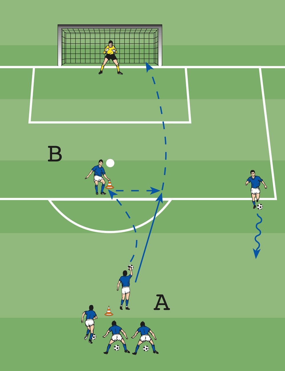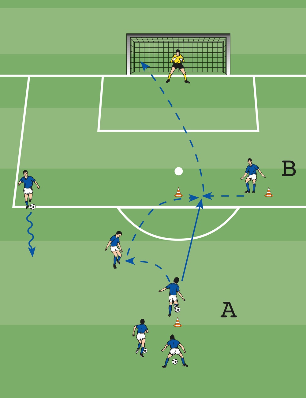 - A spielt zu B, der zum Torhüter weiterleitet.