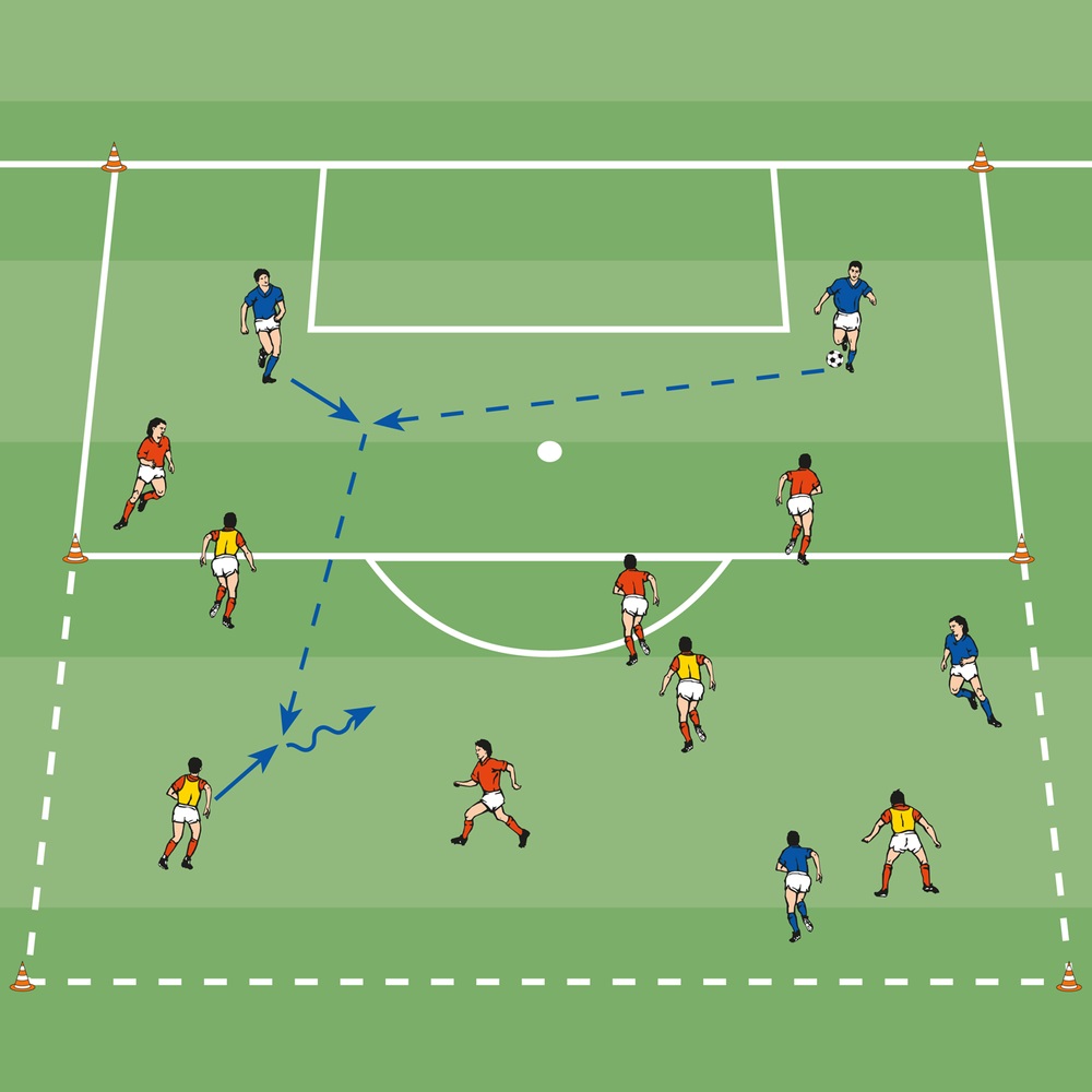 - Zwischen A und B seitlich versetzt einen weiteren Spieler postieren, auf den das erste Anspiel volley oder per Zuwurf erfolgt.