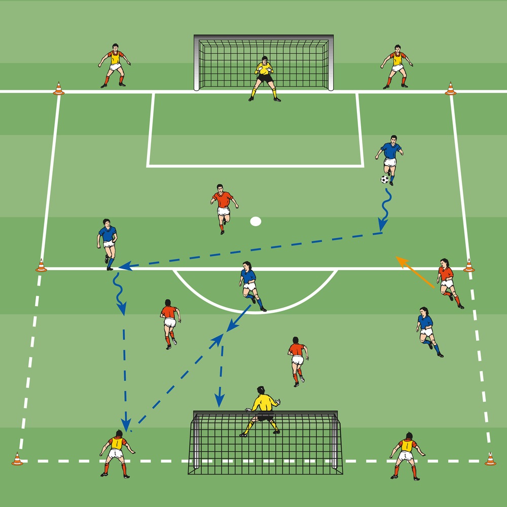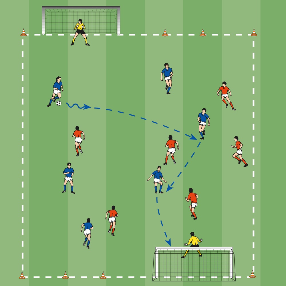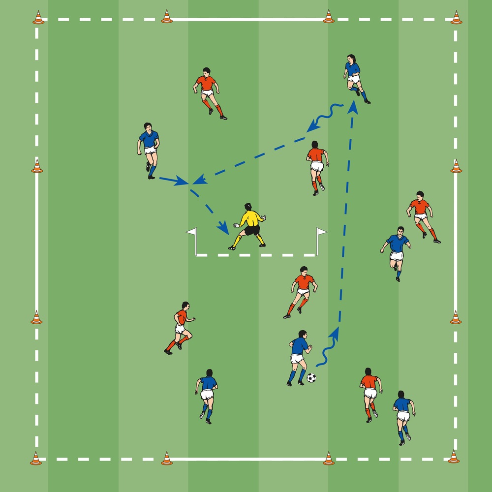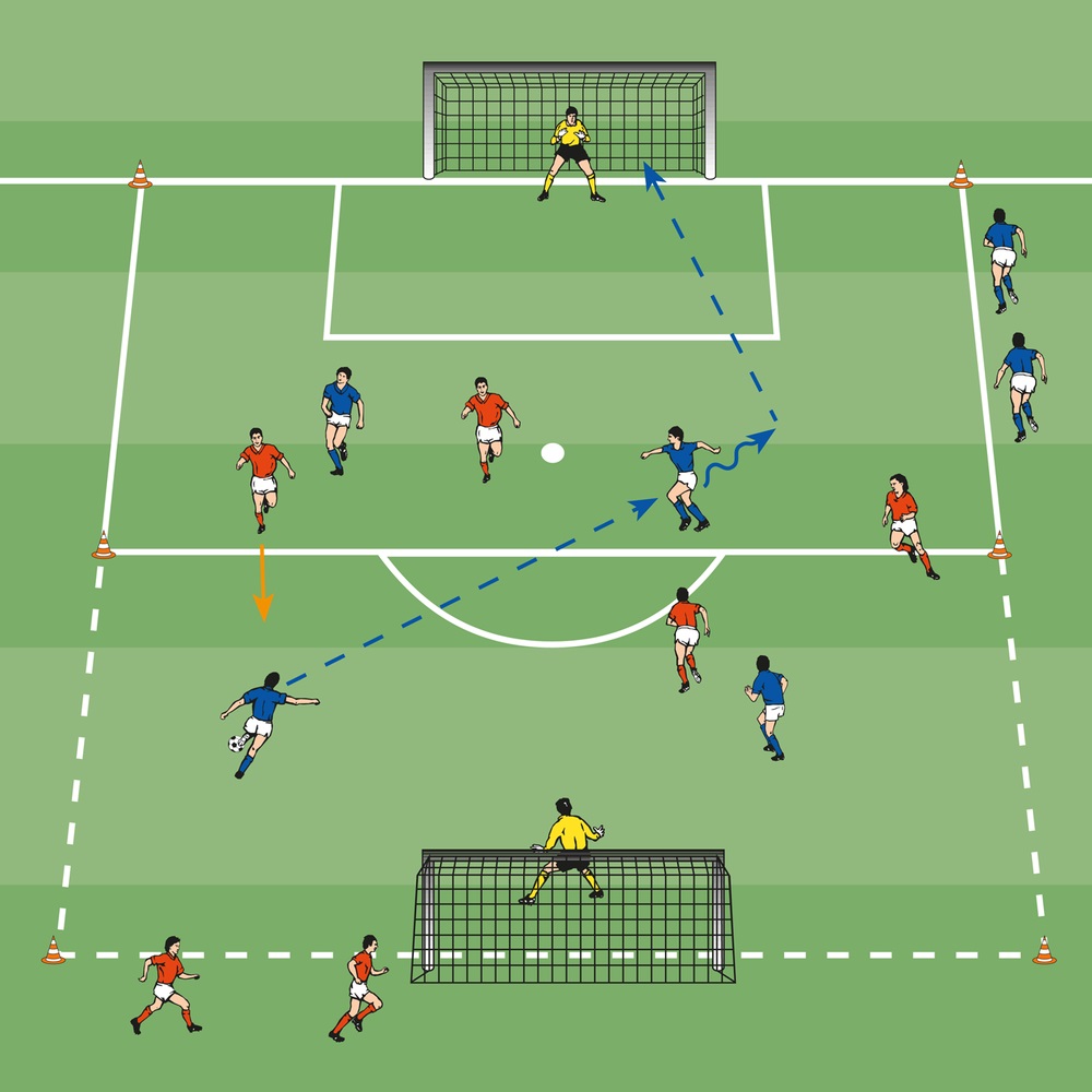- Ein Angreifer soll eine Grundlinie überdribbeln und den Torhüter ausspielen.