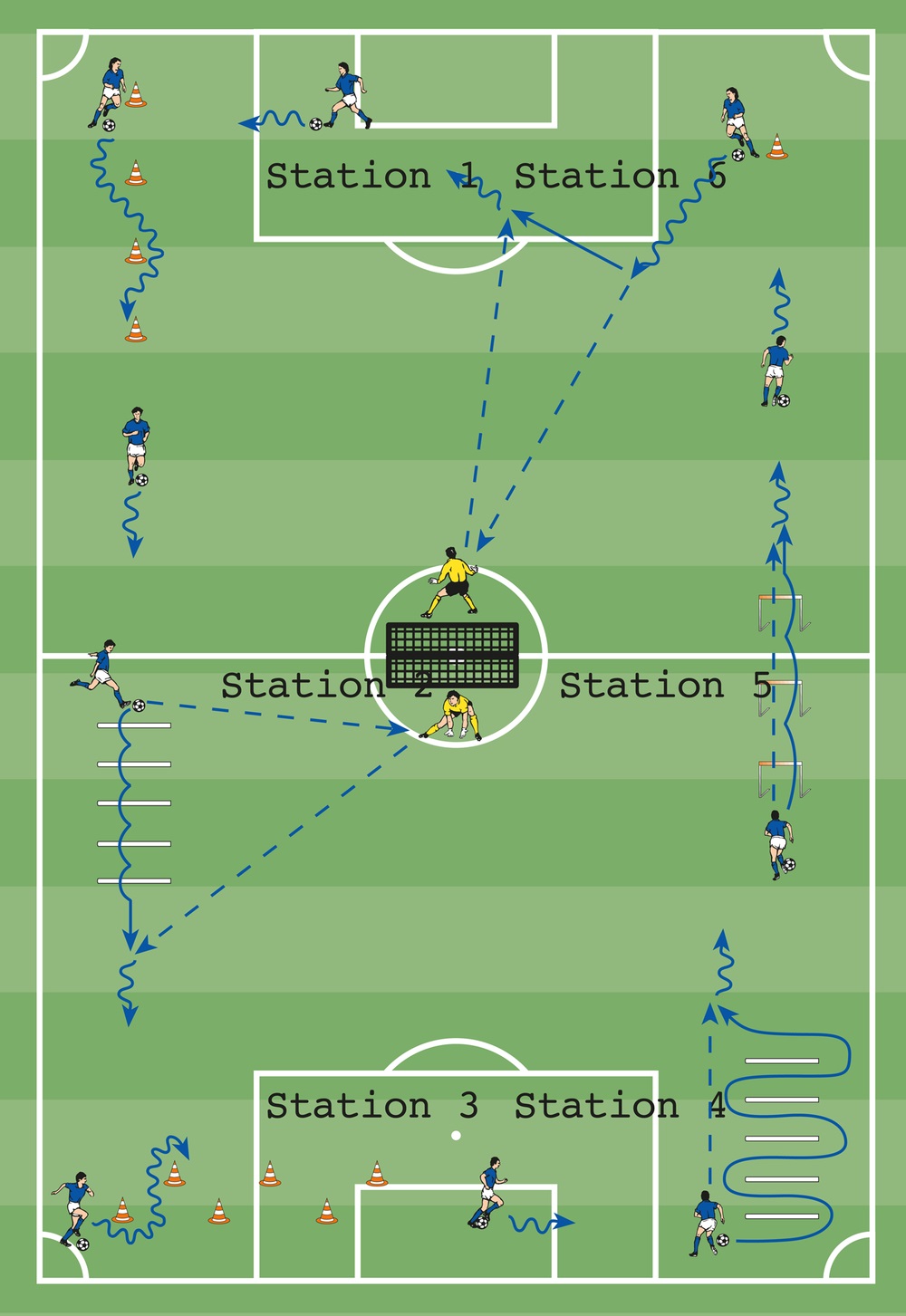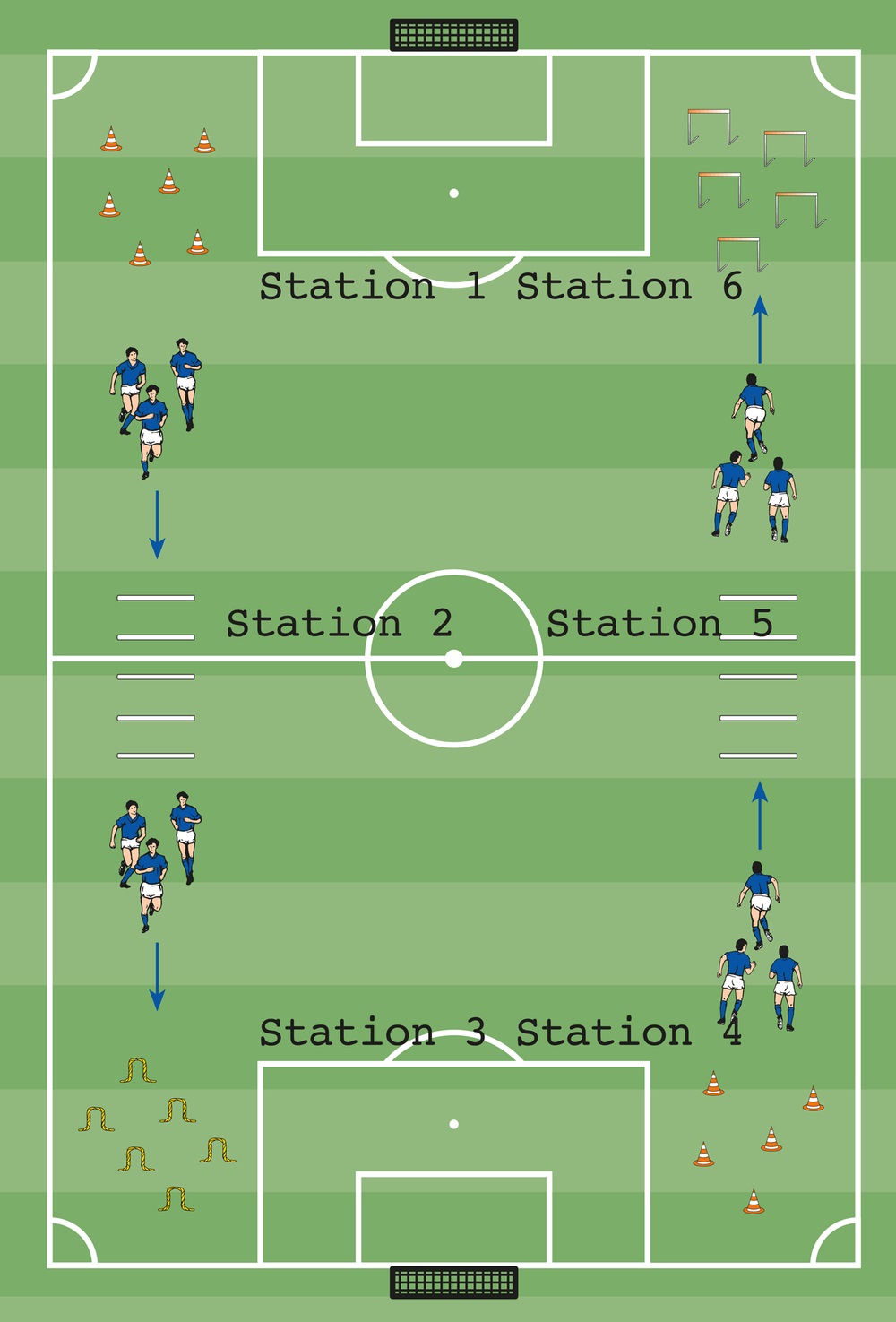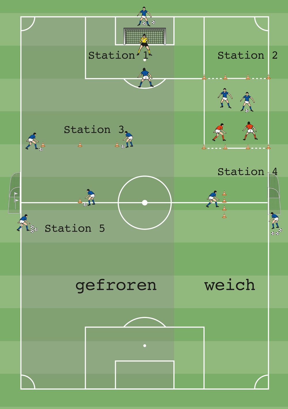 - Die Spieler umlaufen in zügigem Tempo 12 bis 15 Minuten das Spielfeld und absolvieren dabei an den Stationen verschiedene Aufgaben: