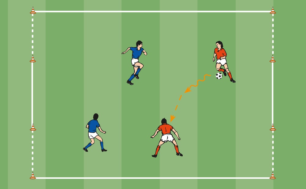 - Spiel 2 gegen 2 auf die 4 Tore. Jede Mannschaft verteidigt zwei nebeneinanderliegende Tore und greift auf die anderen beiden an.