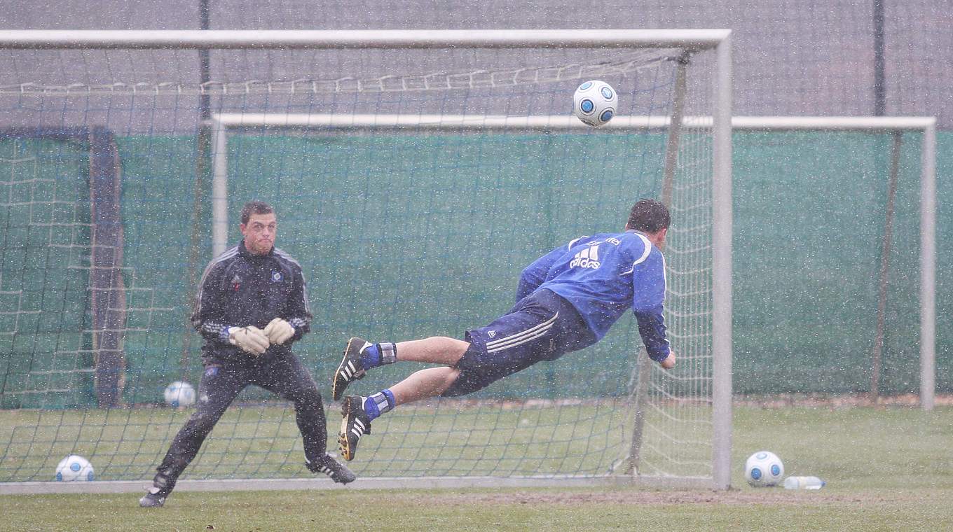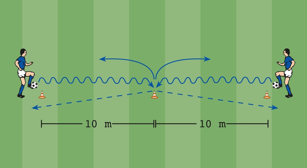 - Der Spieler hinter dem Tor schießt volley zu dem 20 Meter vor dem Tor stehenden Partner.