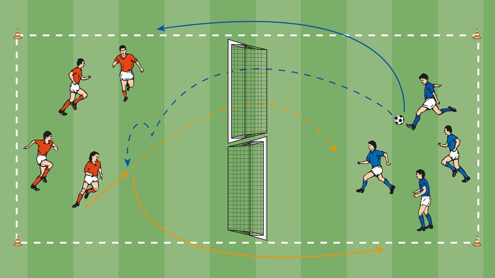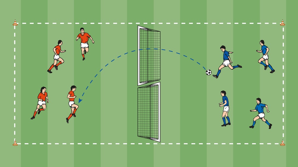 - A schließt volley ab und wechselt auf Position B. B holt den Ball
