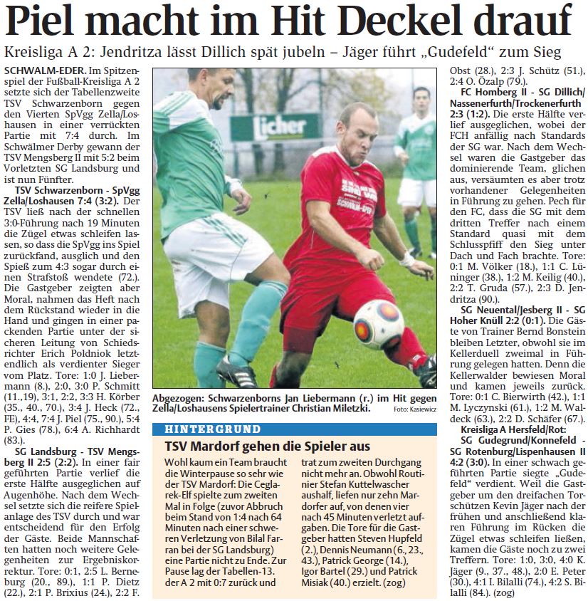 - Spielberichte vom WochenendeFC Homberg II - SG Dillich/Nassenerfurth/Trockenerfurth 2:3 (1:2). Die erste Hälfte verlief ausgeglichen, wobei der FCH anfällig nach Standards der SG war. Nach dem Wechsel waren die Gastgeber das dominierende Team, glichen aus, versäumten es aber trotz vorhandener Gelegenheiten in Führung zu gehen. Pech für den FC, dass die SG mit dem dritten Treffer nach einem Standard quasi mit dem Schlusspfiff den Sieg unter Dach und Fach brachte. Tore: 0:1 M. Völker (18.), 1:1 C. Lüninger (38.), 1:2 M. Keilig (40.), 2:2 T. Gruda (57.), 2:3 D. Jendritza (90.). | |||||||||||||||||||