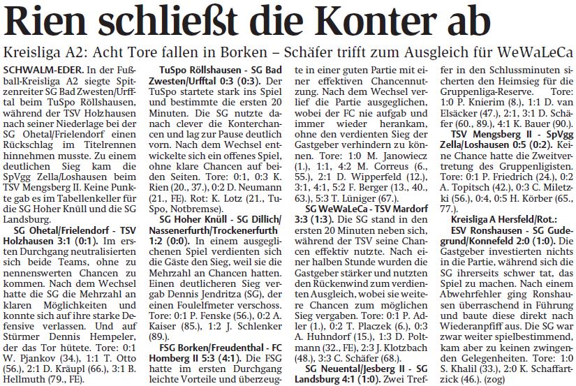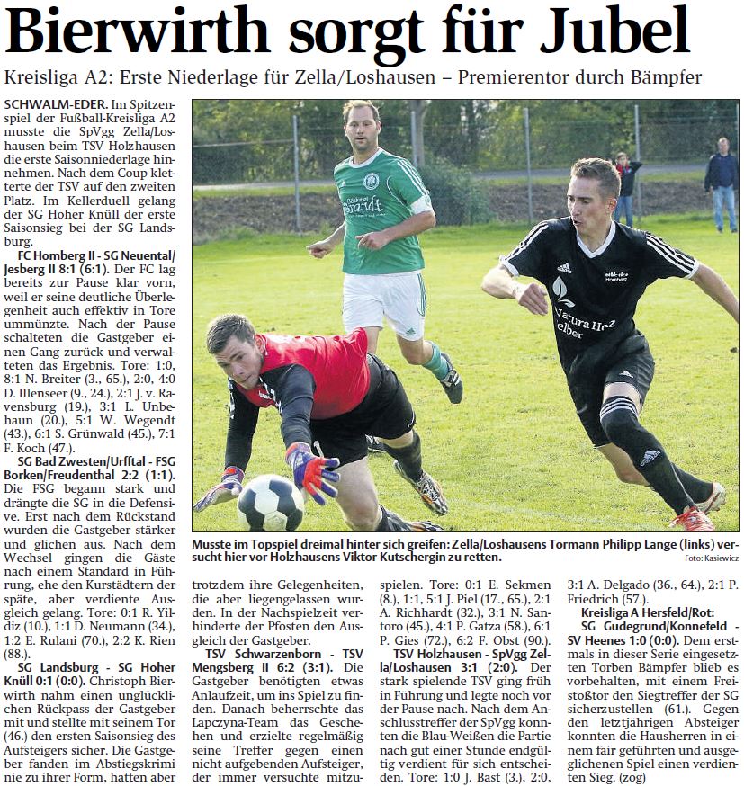 - Spielberichte vom WochenendeSG Dillich/Nassenerfurth/Trockenerfurth - spielfrei. Im Spitzenspiel der Fußball-Kreisliga A2 musste die SpVgg Zella/Loshausen beim TSV Holzhausen die erste Saisonniederlage hinnehmen. Nach dem Coup kletterte der TSV auf den zweiten Platz. Im Kellerduell gelang der SG Hoher Knüll der erste Saisonsieg bei der SG Landsburg. | |||||||||||||||||||