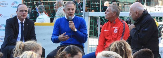 Liebe Fußballfreunde, das Fair Play Forum des Hessischen Fußballs und die Sportjugend Hessen haben das große Einheitsfest in Frankfurt rund um den Tag der Deutschen Einheit mit der Abschlussveranstaltung als Höhepunkt ihres Projekts „Straßenfußball für Toleranz“ (SfT) gefeiert. Mitten auf der bekannten Einkaufsmeile „Zeil“ stand das Spielfeld mit kleinen Toren, außen durch Banden und Netze begrenzt. Den Höhepunkt der Veranstaltung markierte ein Zeitzeugengespräch mit Peter Beuth, Hessischer Minister des Innern und für Sport sowie den ehemaligen Frankfurter Bundesliga-Profis Karl-Heinz Körbel und Norbert Nachtweih, der sich im Rahmen eines U21-Länderspieles der DDR in den Westen absetzte. So verlief Nachtweihs Flucht...