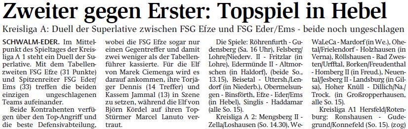 +++ Senioren aktuell: Vorberichte Kreisliga A - HNA vom 09.10.2015 +++