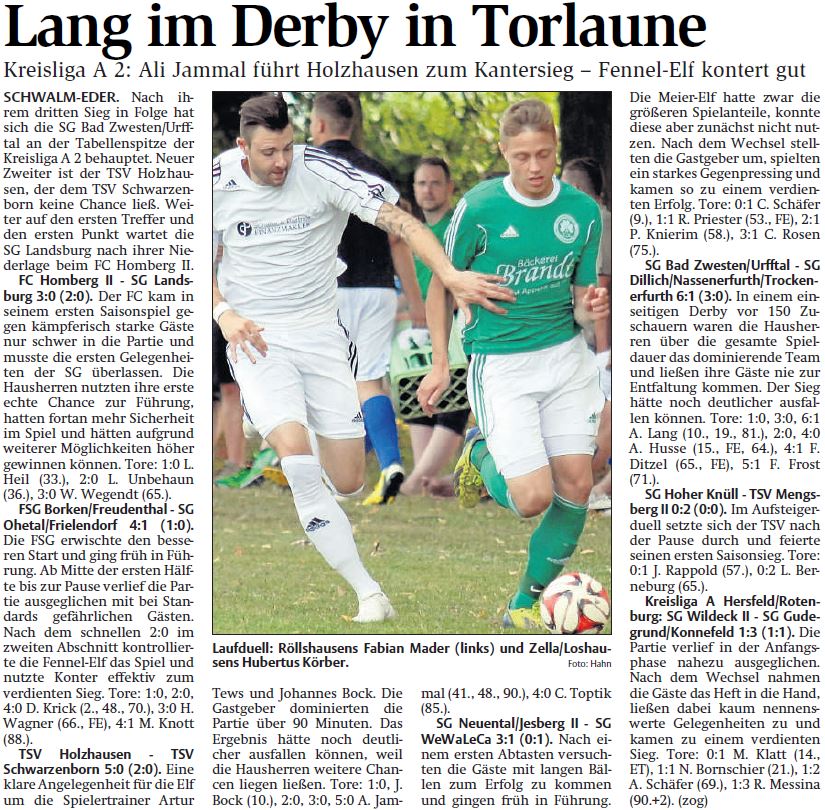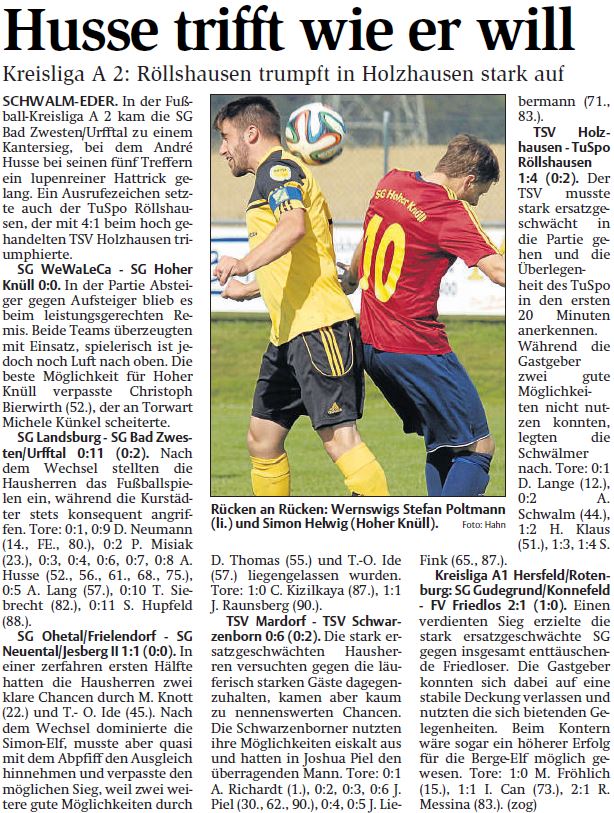 - Spielberichte vom WochenendeSG Dillich/Nassenerfurth/Trockenerfurth - spielfrei. In der Fußball-Kreisliga A2 kam die SG Bad Zwesten/Urfftal zu einem Kantersieg, bei dem André Husse bei seinen fünf Treffern ein lupenreiner Hattrick gelang. Ein Ausrufezeichen setzte auch der TuSpo Röllshausen, der mit 4:1 beim hoch gehandelten TSV Holzhausen triumphierte. | |||||||||||||||||||