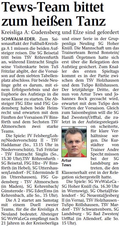 HNA Schwalm-Eder-SportSonntag, 09.08.2015 15:00 Uhr : SG Bad Zwesten/Urfftal - SG Di/Na/Tro | |||||||||||||||||||