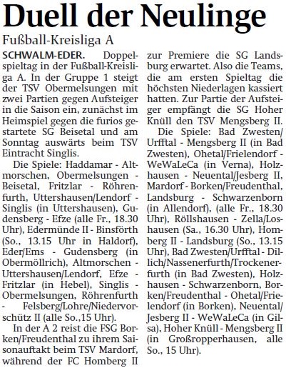 +++ Senioren aktuell: Vorberichte Kreisliga A - HNA vom 31.07.2015 +++