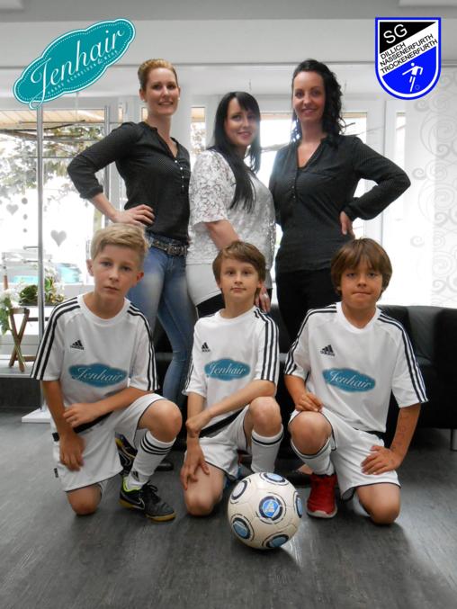 "Jenhair - Haare schneiden und mehr". Das "mehr" steht in diesem Fall für die Unterstützung der F-Jugend der Auf dem Foto ist das Jenhair-Team mit Patricia Becker, Franziska Grüber und Jennifer Wagner (von links) zu sehen. Leider fehlt Denise Heimberg. Die stolzen F-Jugendlichen Filip Milbrandt, Noah Wanner und Luca Jäger weihten die Trikots bereits mit einem Sieg ein. Die SG Di/Na/Tro bedankt sich und wünscht beiden Teams alles Gute für die Zukunft. | ||||||||||||||||||||||||||||
