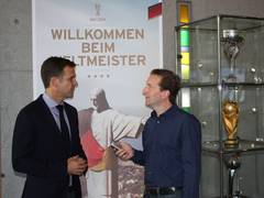 "Ehrenrunde"-Start: Gänsehaut in Frankfurt Jede Menge Gänsehaut und strahlende Gesichter: Unsere Ehrenrunde, bei der wir mit der "2014 FIFA World Cup Winner's Trophy" bei 63 Vereinen in ganz Deutschland für je einen Tag lang halten werden, ist am Dienstagmittag in Frankfurt-Niederrad gestartet. Zur Premiere kamen unter anderen DFB-Präsident Wolfgang Niersbach, DFB-Sportdirektor Hansi Flick, Weltmeister Bernd Hölzenbein und Eintracht-Keeper Kevin Trapp. Wir haben den Pokal hervorgeholt und vorsichtig-liebevoll abgewischt, wir haben zwei Trucks komplett um- und zusammengebaut , wir haben insbesondere in den vergangenen Tagen und Wochen kräftig gewuselt, gearbeitet, geschwitzt - alles für diesen einen Moment: "Wenn sich die Tür im Truck öffnet, dann ist man ehrfürchtig und andächtig. Es wird einem gleichzeitig heiß und kalt. Diese Freude, dieses Gefühl, dieses ganz besondere Erlebnis, das wollen wir weitergeben!", sagt DFB-Präsident Wolfgang Niersbach wenige Momente, nachdem er aus den Ehrenrunde -Trucks gekommen und dem WM-Pokal ganz nah war. Mehr...
