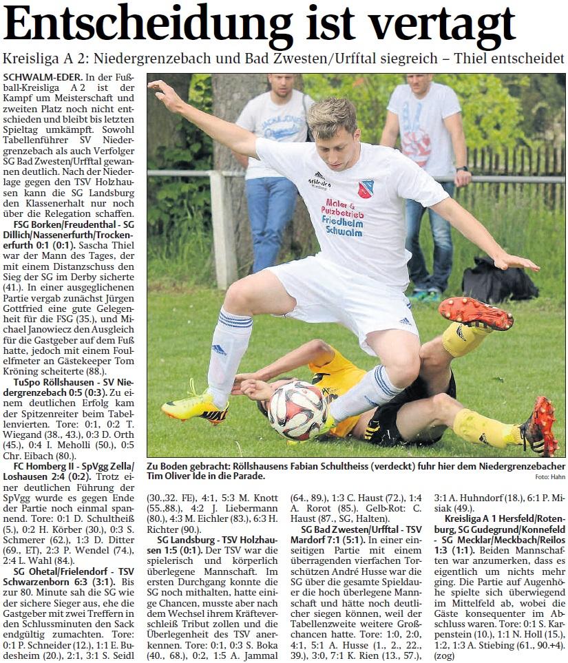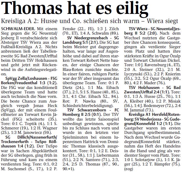 +++ Senioren aktuell: Berichte Kreisliga A - HNA vom 26.05.2015 +++