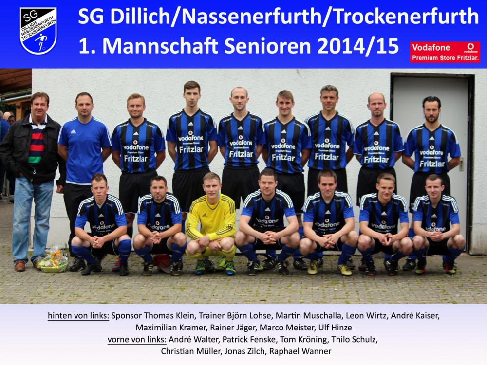 Die Seniorenfußballer der SG Di/Na/Tro wurden von der Firma Vodafone Premium Store in Fritzlar mit neuen Trikotsätzen eingekleidet. Mit diesem Foto möchten die Vorstände der drei Trägervereine, Geschäftsführer R. Jäger und Trainer B. Lohse sowie die Spieler ihren Dank an den Geschäftsführer Thomas Klein aussprechen. | |||||||||||||||||||