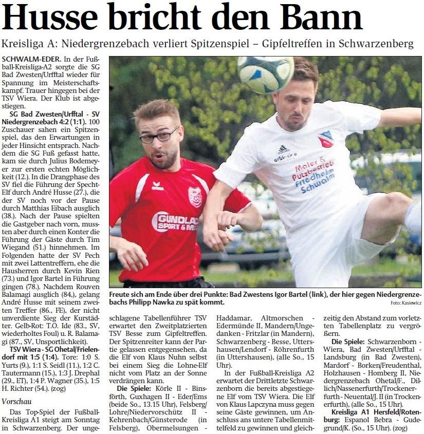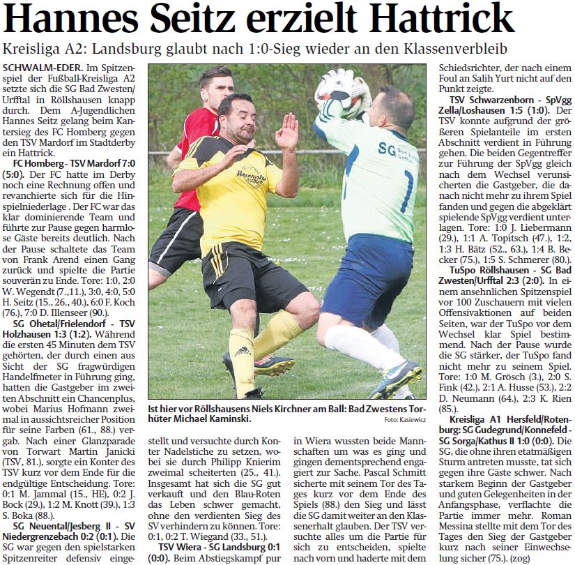- Spielberichte vom WochenendeSG Dillich/Nassenerfurth/Trockenerfurth - spielfrei. Im Spitzenspiel der Fußball-Kreisliga A2 setzte sich die SG Bad Zwesten/Urfftal in Röllshausen knapp durch. Dem A-Jugendlichen Hannes Seitz gelang beim Kantersieg des FC Homberg gegen den TSV Mardorf im Stadtderby ein Hattrick. | |||||
