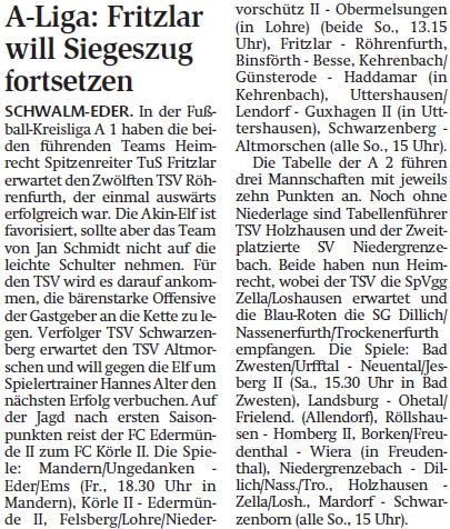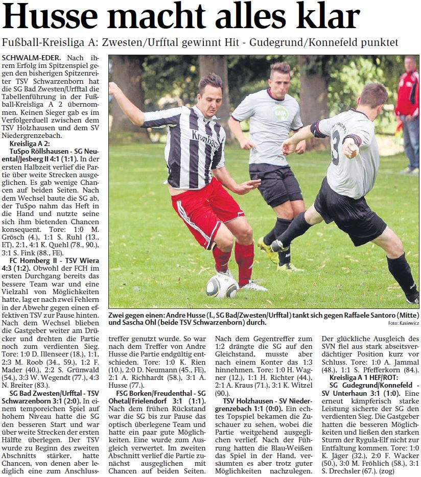 In der Fußball-Kreisliga A2 Schwalm-Eder hat die SG Bad Zwesten/Urfftal mit einem 3:1 (2:0)-Sieg gegen den TSV Schwarzenborn die Tabellenführung übernommen. Im Topspiel kamen der TSV Holzhausen und der SV Niedergrenzebach nicht über ein 1:1 (0:0)-Unentschieden hinaus. Die FSG Borken/Freudenthal holte mit dem 3:1-Sieg gegen Absteiger Ohetal/Frielendorf den ersten Dreier dieser Spielzeit und Homberg II setzte sich gegen den punktlosen TSV Wiera durch.