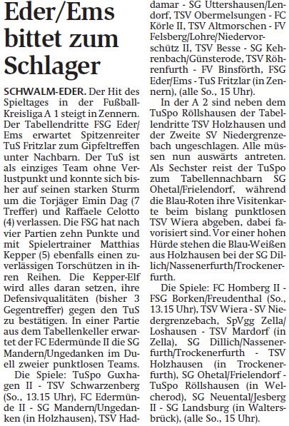 +++ Senioren aktuell: Vorberichte Kreisliga A - HNA vom 05.09.2014 +++