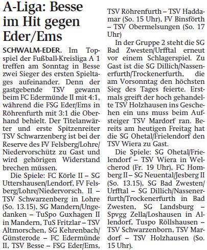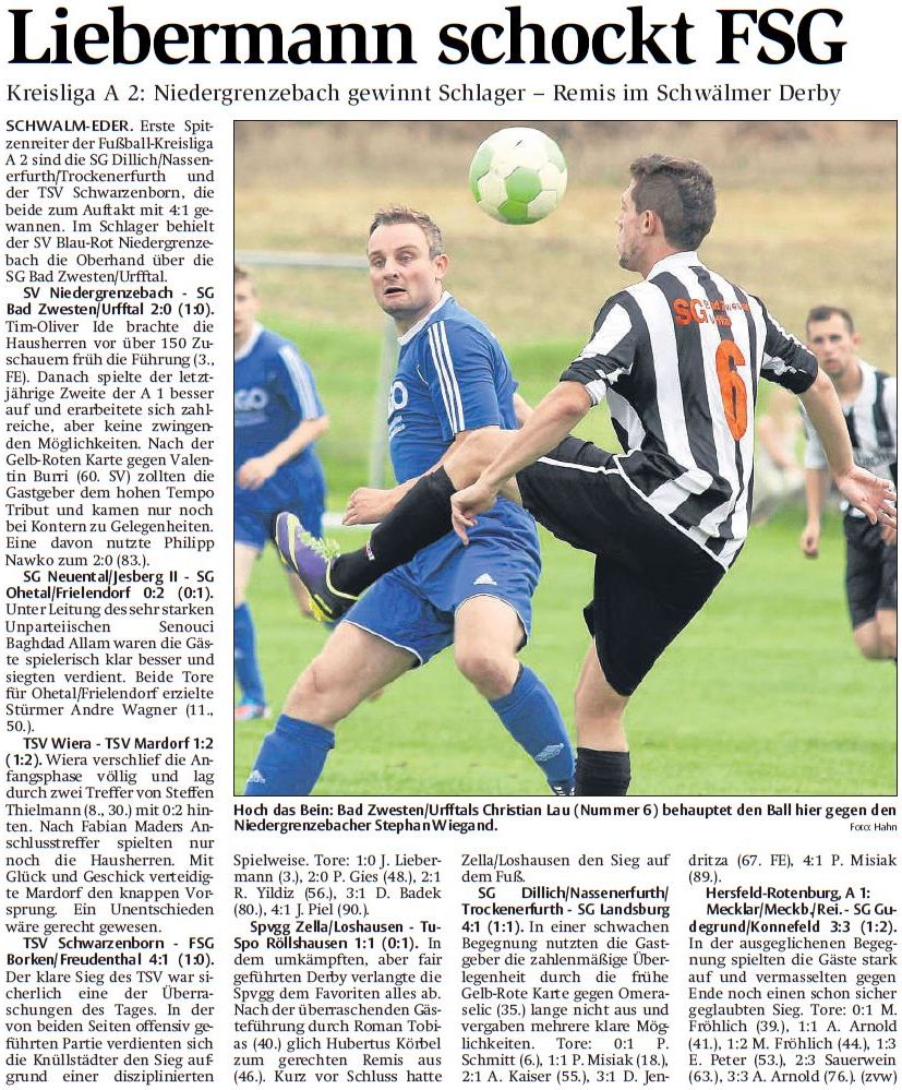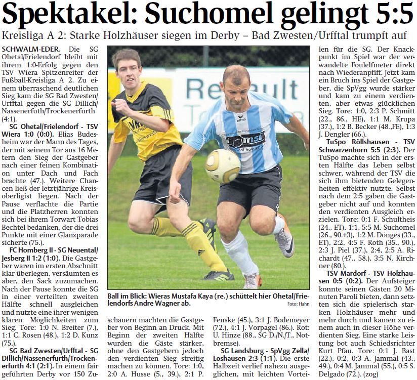 - Spielberichte vom WochenendeSG Bad Zwesten/Urfftal - SG Dillich/Nassenerfurth/Trockenerfurth 4:1 (2:1). In einem fair geführten Derby vor 150 Zuschauern machten die Gastgeber von Beginn an Druck. Mit Beginn der zweiten Hälfte wurden die Gäste stärker, ohne den Gastgebern jedoch den verdienten Sieg streitig machen zu können. Tore: 1:0, 2:0 A. Husse (5., 39.), 2:1 P. Fenske (45.), 3:1 J. Bodemeyer (72.), 4:1 J. Vorpagel (86.). Rot: U. Hinze (88., SG D./N./T., Notbremse).