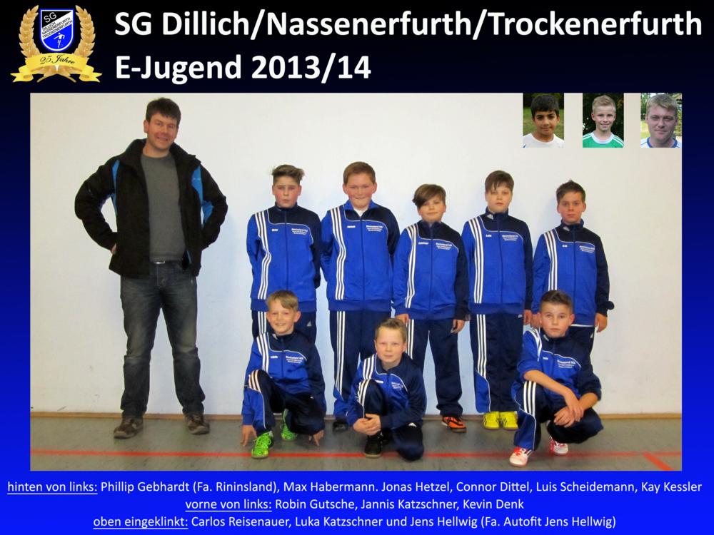 - Rechtzeitig zu Beginn der Saison 2014 präsentiert sich die E-Jugend der SG Di/Na/Tro in komplett neuen Trainingsanzügen.