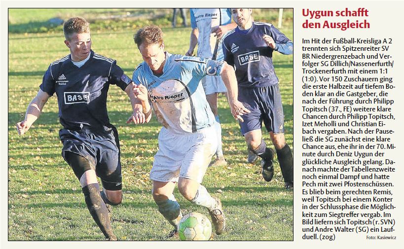 Im Hit der Fußball-Kreisliga A 2 trennten sich Spitzenreiter SV BR Niedergrenzebach und Verfolger SG Dillich/Nassenerfurth/Trockenerfurth mit einem 1:1 (1:0).