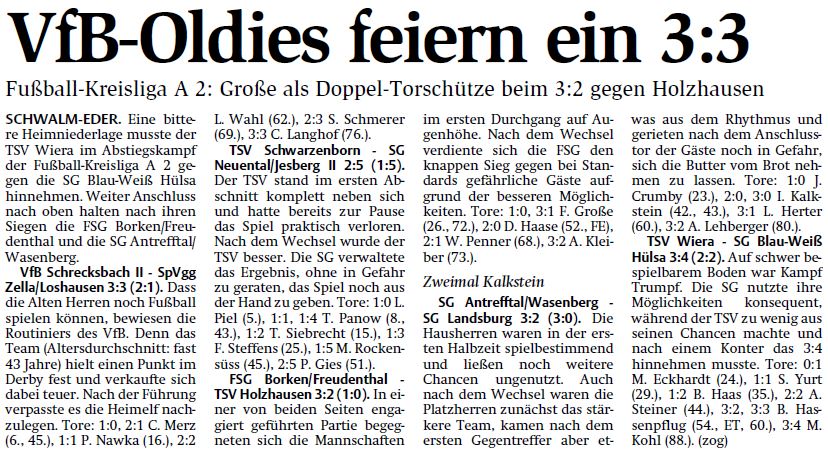 Von der Pleite der SG hätte auch Aufsteiger FSG Borken/Freudenthal profitieren können. Die Mannschaft von Trainer Matthias Fennel kam bei der SG Landsburg aber nicht über ein 1:1 (0:0)-Unentschieden hinaus. Fabian Große brachte die Blumenhainer Mitte der zweiten Halbzeit mit seinem 20. Saisontor mit 1:0 in Front. Der eingewechselte Steffen Haase erzielte sieben Minuten vor dem Ende den 1:1-Ausgleich. Während die FSG den Platz auf den zweiten Platz verpasste und auf Rang drei verharrt, bleibt die SG mit acht Punkten im Tabellenkeller stecken.