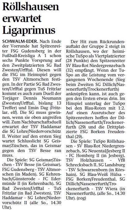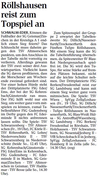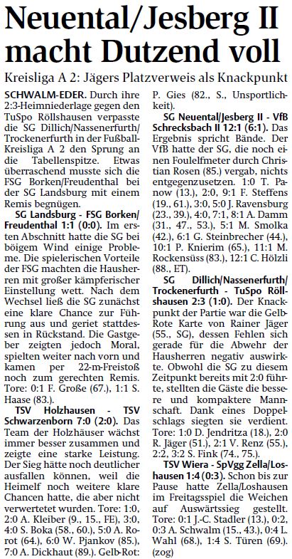 Vier Spiele, zwei Absagen und jede Menge Tore gab es heute in der Fußball-Kreisliga A2 Schwalm-Eder. Im Topspiel setzte sich der TuSpo Röllshausen mit 3:2 (0:1) bei der SG Dillich/Nassenerfurth/Trockenerfurth durch. Aufsteiger FSG Borken/Freudenthal kam bei der SG Landsburg nicht über ein 1:1 (0:0)-Remis hinaus. Schlusslicht VfB Schrecksbach ging bei der SG Neuental/Jesberg II mit 1:12 (1:6) baden und der TSV Holzhausen schickte den TSV Schwarzenborn mit einer 7:0-Packung nach Hause.