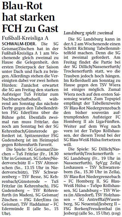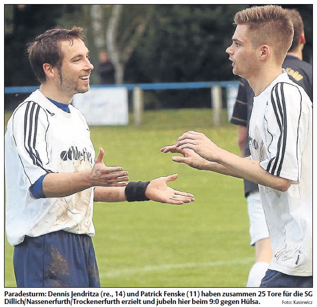 - Spielberichte vom WochenendeSG Dillich/Nassenerfurth/Trockenerfurth – SG Blau-Weiß Hülsa 9:0 (5:0). Einbahnstraßenfußball in Nassenerfurth. Trotz des hohen Sieges ließ das Team von Björn Lohse gegen überforderte Gäste weitere gute Möglichkeiten liegen. Tore: 1:0, 9:0 R. Jäger (6., 88.), 2:0, 5:0 P. Fenske (10., 45.), 3:0, 4:0 C. Müller (15., 27.), 6:0 D. Jendritza (66.), 7:0 D. Uygun (67.), 8:0 A. Kaiser (85.). | ||||