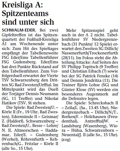 Ligavorschau - Bericht vom Freitag, den 25. Oktober 2013 um 15:02 UhrErster gegen Zweiter - Topspiel in Niedergrenzebach +++ Kellerduell zwischen Wiera und Hülsa +++ Setzt Borken/Freudenthal seine Serie fort?