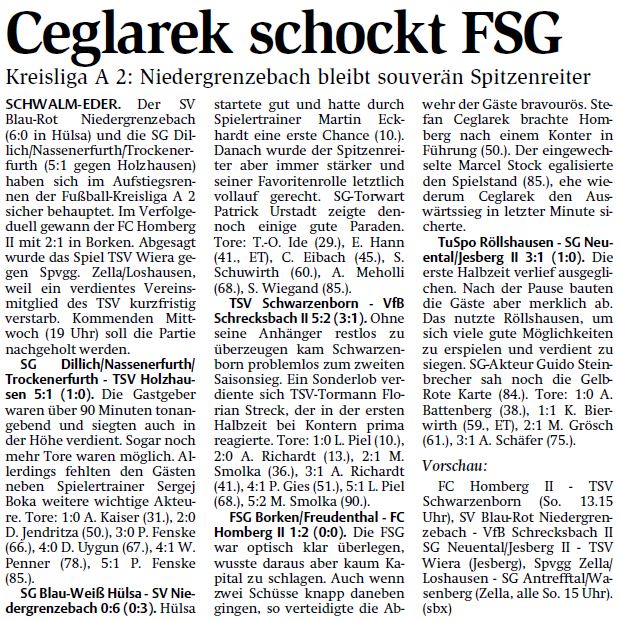Auch Absteiger Dillich/Nassenerfurth/Trockenerfurth musste am Feiertag keine allzu schwere Aufgabe bewältigen. Gegen den TSV Holzhausen war der letztjährige Kreisoberligist vor allen der zweiten Halbzeit die deutlich bessere Mannschaft und behielt letztendlich klar mit 5:1 (1:0) die Oberhand. Torjäger Patrick Fenske schnürrte einen Doppelpack und schob sein Trefferkonto auf zwölf hoch. Neben Fenske trugen sich auch Dennis Jendritza, André Kaiser und Deniz Uygun in die Torschützenliste ein. Den Ehrentreffer zum 1:4 erzielte Waldemar Penner. Holzhausen bleibt nach der Pleite als Achter im gesicherten Mittelfeld.