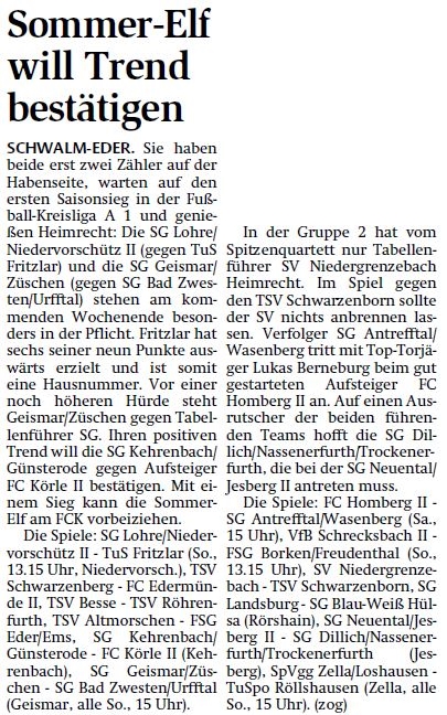 In Lauerstellung liegt weiterhin die SG Dillich/Nassenerfurth/Trockenerfurth. Der Absteiger setzte sich gegen die zweite Mannschaft der SG Neuental/Jesberg mit 3:0 (1:0) durch und liegt mit drei Zählern Rückstand in Schlagdistanz zur Spitze. Dennis Jendritza, der doppelt einnetzte und Deniz Uygun waren für den sechsten Saisonsieg der Lohse-Elf verantwortlich.