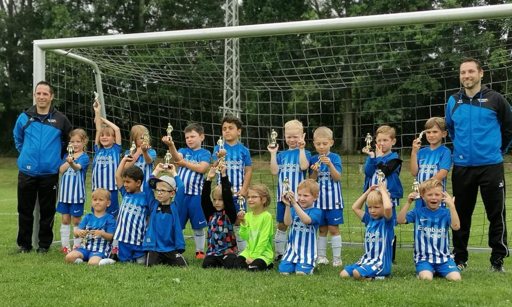 Am 16.06.2019 waren wir selbst Gastgeber eines Bambini-Turniers. Ausgetragen wurde es in Trockenerfurth auf dem Sportplatz.Spielbeginn war morgens um 10:00 Uhr, bei mäßigem Wetter mit leichtem Dauerregen. Wir konnten dennoch alle Mannschaften bei unserem Turnier begrüßen und waren selbst in der glücklichen Situation, dass wir 2 Teams ins Rennen schicken konnten. So hatten wir ein füllendes Turnierprogramm mit 6 Teams, welche im Modus Jeder gegen Jeden antraten. Teilnehmerfeld setzte sich aus folgenden Mannschaften zusammen, die JSG Neuental-Jesberg, JSG Geismar, JSG Bad Zwesten/Urfftal und die JSG Dillich/Ohetal/Fr die gleich mit 3 Teams angetreten ist. Das Turnier entwickelte sich wirklich gut. Es waren viele spannende und auch umkämpfte Spiele dabei. Die Kinder zeigten mal wieder, dass sie unheimlich viel Spaß am Fußball spielen haben, den das anfängliche Wetter schien ihnen nichts aus zu machen. Vielleicht war es auch der Grund, weshalb der Regen schließlich aufhörte und das Turnier bei bestem Wetter zu Ende gespielt werden konnte. Die zahlreichen Zuschauern die mitgekommen waren, wurden in ihren Erwartungen keineswegs enttäuscht. Die Kid`s begeisterten mit ihrer Motivation und den vielen erzielten Toren. Die Zuschauer begleiteten jedes Spiel der Kinder mit viel Applaus und das auch zu recht. Es hat uns als Trainer wieder einmal gefreut, dass alle Kid`s super mitgezogen haben, wobei man gegen Ende des Turniers schon bei den jüngsten Ermüdungserscheinungen gesehen hat. Aber am Ende bei der Siegerehrung waren alle super glücklich und jedes Kind machte sich mit seinem eigenen Pokal auf den Heimweg.