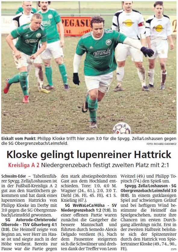 Tabellenführer Spvgg. Zella/Loshausen ist in der Fußball-Kreisliga A 2 gut aus den Startlöchern gekommen und hat dank eines lupenreinen Hattricks von Philipp Kloske im Derby mit 3:0 gegen die SG Obergrenzebach/Leimsfeld gewonnen.