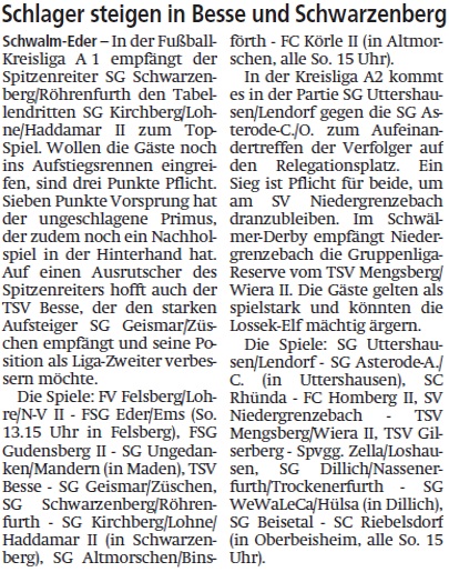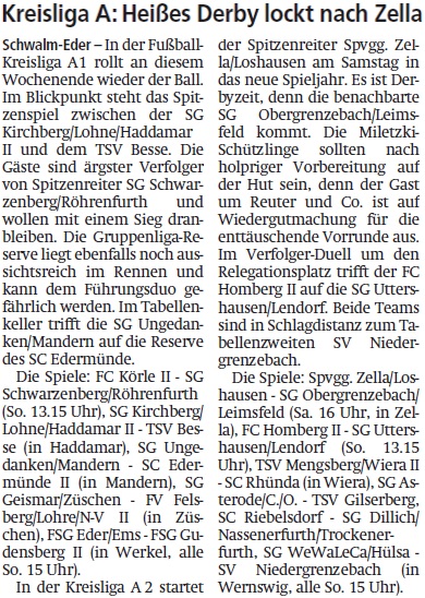 +++ Senioren aktuell: Vorberichte Kreisliga A - HNA vom 15.03.2019 +++