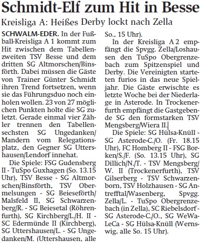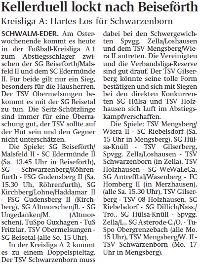 +++ Senioren aktuell: Vorberichte Kreisliga A - HNA vom 06.04.2018 +++