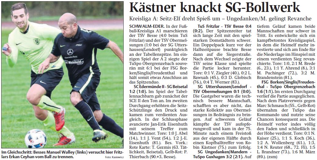 Im einzigen Spiel der A 2 siegte der TuSpo Obergrenzebach souverän mit 6:1 bei der FSG Borken/Singlis/Freudenthal und hält somit etwas Anschluss an das Spitzenduo.