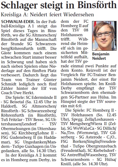 Im Knüll-Derby empfängt der TSV Schwarzenborn den ehemaligen SG-Partner aus Hülsa.