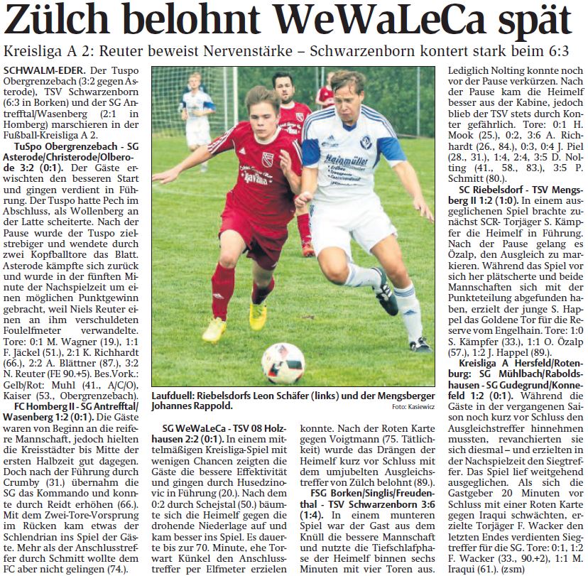 Der Tuspo Obergrenzebach (3:2 gegen Asterode), TSV Schwarzenborn (6:3 in Borken) und der SG Antrefftal/Wasenberg (2:1 in Homberg) marschieren in der Fußball-Kreisliga A 2.