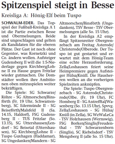 +++ Senioren aktuell: Vorberichte Kreisliga A - HNA vom 11.08.2017 +++