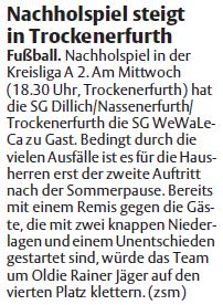 Nachholspiel in der Kreisliga A 2. Am Mittwoch (18.30 Uhr, Trockenerfurth) hat die SG Dillich/Nassenerfurth/Trockenerfurth die SG WeWaLeCa zu Gast.