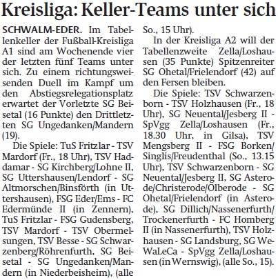 - Die Top-Vier der Fußball-Kreisliga A2 hielten sich am 18. Spieltag schadlos. Primus Ohetal/Frielendorf bezwang den TSV Schwarzenborn mit 3:1, der Tabellenzweite SpVgg Zella/Loshausen schlug den TSV Mengsberg II deutlich mit 4:1, die SG Asterode/C.-O. setzte ihren Siegeszug mit einem 2:0 in Homberg fort und die SG WeWaLeCa ließ in Gilsa (2:1) nichts anbrennen.