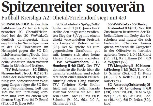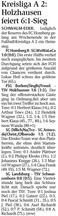TSV 08 Holzhausen - SG Dillich/Nassenerfurth/Trockenerfurth 0:2 (0:1). Unter der souveränen Spielleitung von Schiedsrichter Wolfgang Zarges zeigte die SG ihre beste Saisonleistung, ließ den TSV nie zur Entfaltung kommen und kam zu einem verdienten Sieg. Tore: 0:1 D. Brand (11.), 0:2 R. Jäger (68.). | |||||||||||||||||||