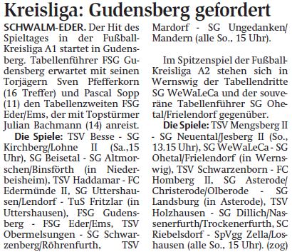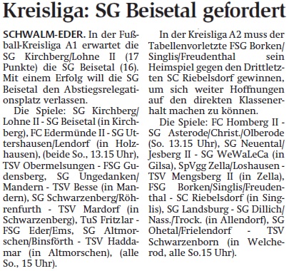 +++ Senioren aktuell: Vorberichte Kreisliga A - HNA vom 31.03.2017 +++