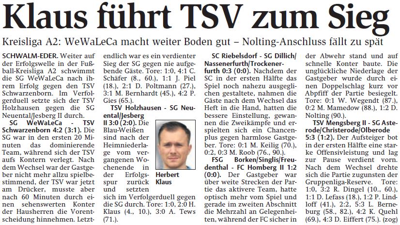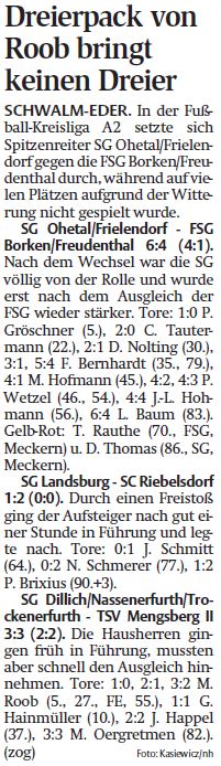 SG Dillich/Nassenerfurth/Trockenerfurth - TSV Mengsberg II 3:3 (2:2). Die Hausherren gingen früh in Führung, mussten aber schnell den Ausgleich hinnehmen. Tore: 1:0, 2:1, 3:2 M. Roob (5., 27., FE, 55.), 1:1 G. Hainmüller (10.), 2:2 J. Happel (37.), 3:3 M. Oergretmen (82.).
