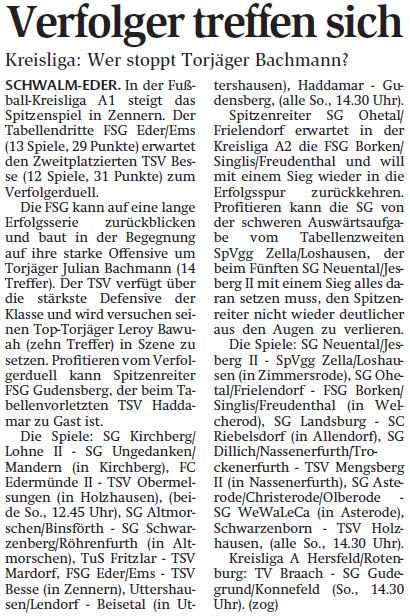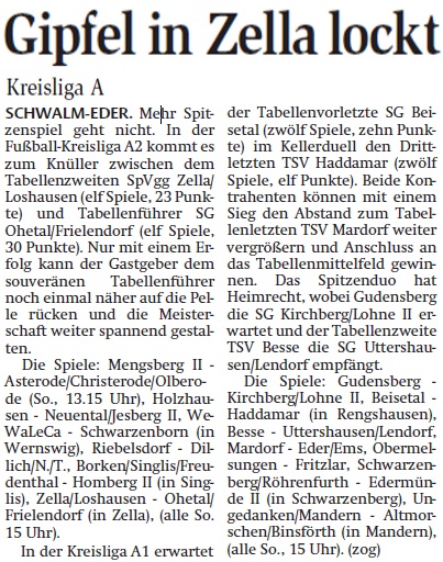 +++ Senioren aktuell: Vorberichte Kreisliga A - HNA vom 28.10.2016 +++