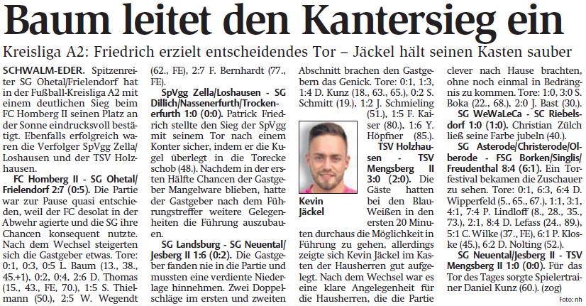 SpVgg Zella/Loshausen - SG Dillich/Nassenerfurth/Trockenerfurth 1:0 (0:0). Patrick Friedrich stellte den Sieg der SpVgg mit seinem Tor nach einem Konter sicher, indem er die Kugel überlegt in die Torecke schob (48.). Nachdem in der ersten Hälfte Chancen der Gastgeber Mangelware blieben, hatte der Gastgeber nach dem Führungstreffer weitere Gelegenheiten die Führung auszubauen. | |||||||||||||||||||