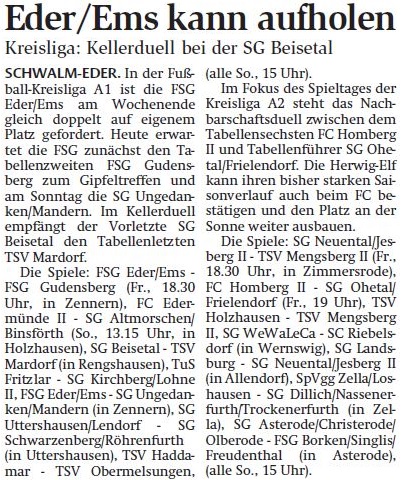 +++ Senioren aktuell: Bericht Kreisliga A - HNA vom 11.10.2016 +++